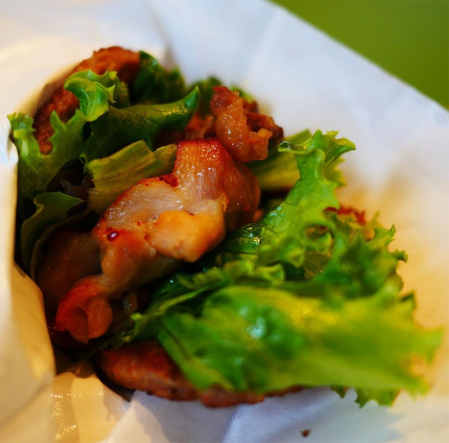 にくにくにくバーガーの構成は、ハンバーグとハンバーグで焼肉とテリヤキチキンとレタスをサンドし、そこにソースで味付けをしたものとなっている。豪快すぎるハンバーガーに思えるが、パンがないのでヘルシー。