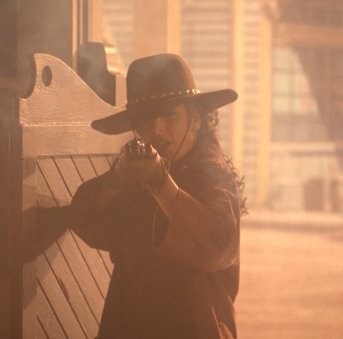 As Eli passes Alexander, he looks at him disdainfully, and just before he reaches his father Frank, he yells at him to get down and draws his gun. Worf warns Alexander and while he runs to the saloon, Worf turns on his makeshift force field, just in time. Frank empties his gun but the bullets are stopped by the force field. When it stops working, one of Frank's accomplices draws his weapon and tries to shoot Worf but he is stopped by Troi, who was hiding under a cover on a nearby wagon. At that time Frank's Mexican accomplice, who was hiding on a roof, throws a gun towards Frank Hollander. As he catches it, Worf draws his weapon and shoots the weapon right out of Frank Hollander's hand.