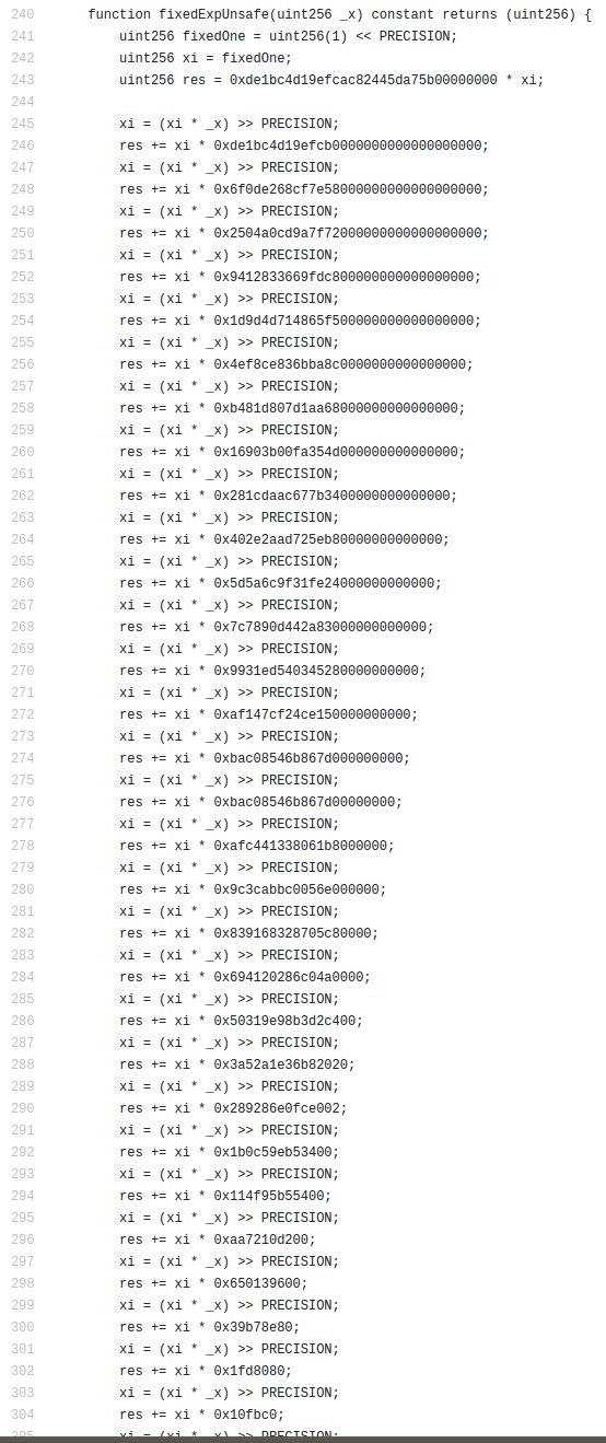 Second, no reimplementation of basic math routines should look the way Bancor’s code looks. It’s a mishmash of special numbers baked into the code. There is a certain style to writing code that is correct by construction. The code has to be crafted such that, not only is it correct, but it is easy to prove correct upon inspection. Bancor code is nothing like that, and baking magic numbers into the code is something for which we penalize first year undergraduates.