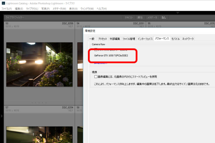 内蔵GPUでいいじゃん。ってなるかもしれませんが、私のパソコンに搭載されている「Intel HD520」では高速化どころか、LightroomがクラッシュしてしまうのでGPUの使用を止めています。内蔵GPUはかなり相性があるようです。