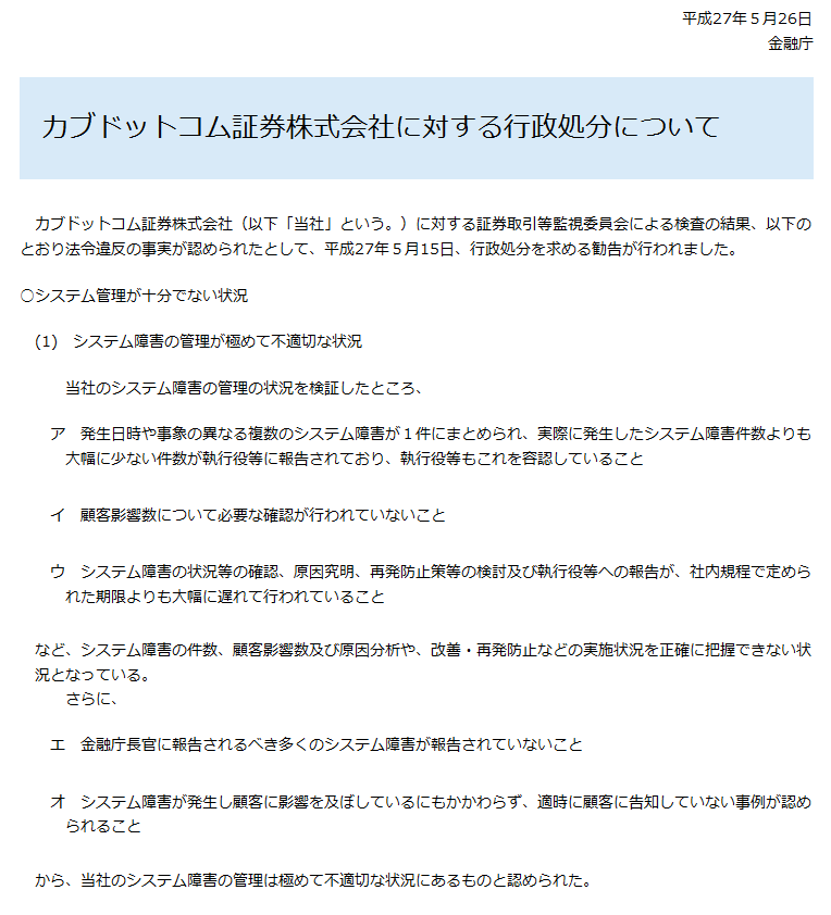 カブドットコム証券株式会社に対する行政処分について:金融庁 https://t.co/IK6jcideZx