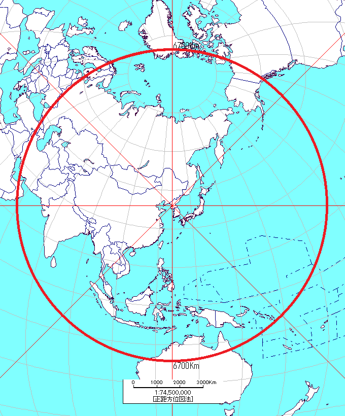 (平壌を中心に6,700kmの射程範囲。正距方位図法。)