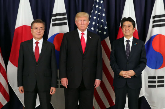 ムンジェイン大統領とドナルド・トランプ米国大統領、日本の安倍晋三首相が6日午後(現地時間)、G20首脳会議が開かれるドイツのハンブルグ市の米国総領事館で開かれた韓米日首脳晩餐をした。