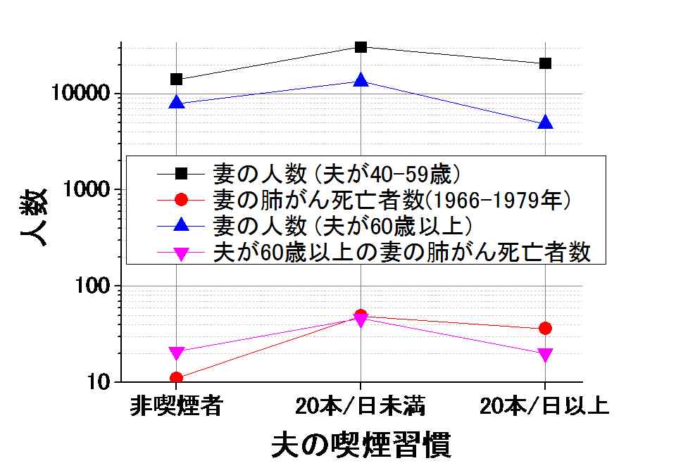 1965年の秋に、6県で、計26万5118人(男12万2261人、女14万2857人)の40歳以上の成人にインタビューを行い、喫煙習慣を聞いたそうです。その対象者についてその後14年間(1966年~1979年)追跡調査を行い、346人の女性が肺がんで亡くなったそうです。そのうち245人が結婚していて、174人は、非喫煙者だったという事です。