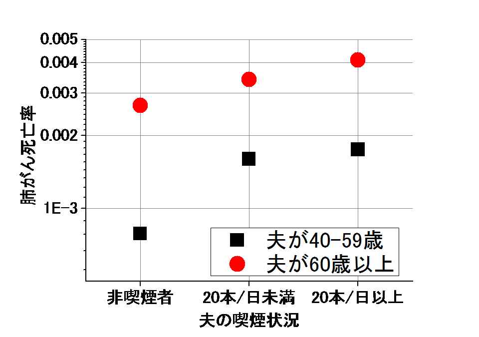夫が一日に20本以上の喫煙者の場合は、夫が非喫煙者の場合の2倍程度、です。年齢依存を見ると、1965年時点で夫が60歳以上だった場合より、59歳以下だったの場合の方が、副流煙効果は大きい、と言う結果でした。