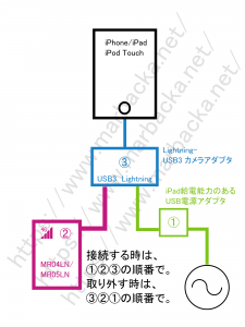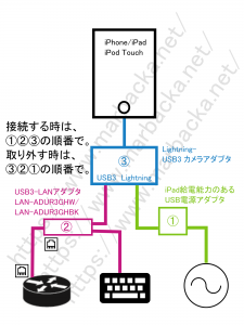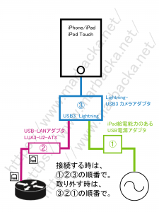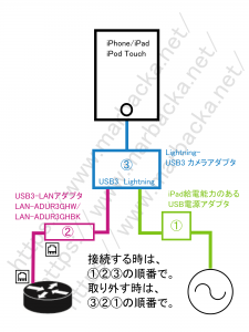 iPhone/iPadのバッテリーだけではLightning-USB3カメラアダプタとUSB-LANアダプタに充分な給電ができないため、上記の順番でつなぐ必要があります。違う順番でつないでみたところ、USB-LANアダプタが認識されませんでした。「カメラアダプタとUSB-LANアダプタに給電してから、iPhone/iPadに接続する」と覚えておけば、つなぐ順番を間違えずに済みます。