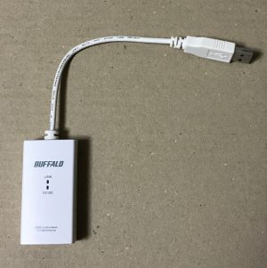 USB-LANアダプタについては、USB3.0対応でかつGigabit対応(仕様上の最高速度1000Mbps)のものとして、サンワサプライのLAN-ADUR3GHWを使います。なおLAN-ADUR3GHWは色がホワイトで、色違いのLAN-ADUR3GHBK(ブラック)もあります。