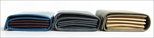 ![]() 左から25、27、30サイズとなります。それぞれ財布のマチの厚みによる違いでレギュラーは25サイズです。大きくなる程、財布の容量が大きくなります。25サイズでお札10枚、コイン大小15枚、カード類15枚程度です。ちょうどズボンのお尻のポケットに収まるサイズです。30サイズだとカード類が2倍の30毎程度になります。また、サイズ毎に素材、色展開が異なります。ご注意ください。 |