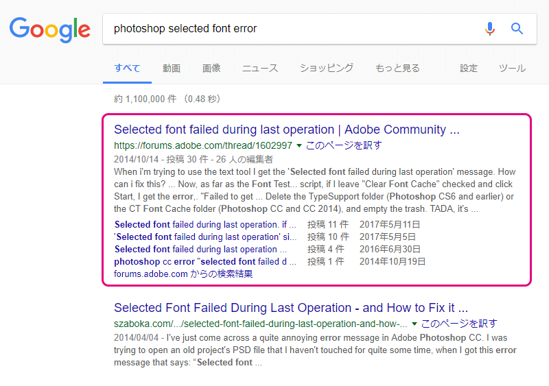 調べてみるにあたって、その時、なぜか、これはAdobe Forum Japanでは質問されていなさそうなエラーだな…と感じたので、適当にダイアログを英訳して「photoshop selected font error」と検索してみました。
