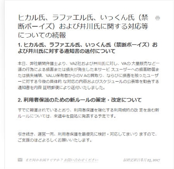今後については「無期限の活動休止とさせていただきます」とヒカルさん。さらにラファエルさんやいっくんさんらが所属する事務所・ネクストステージについても、メンバーと話し合った結果、解散を決めたとのこと。最後は「今回の件は自分たちに責任があり原因があり、ここからどうなっても全てを受け入れる覚悟です。しかし偽ることはもうしません。僕達のVALUを購入してくださった皆さん、視聴者のいなさん、VAZの全ての方、関わって下さった企業のみなさま、本当に申し訳ありませんでした」と深く頭を下げました。