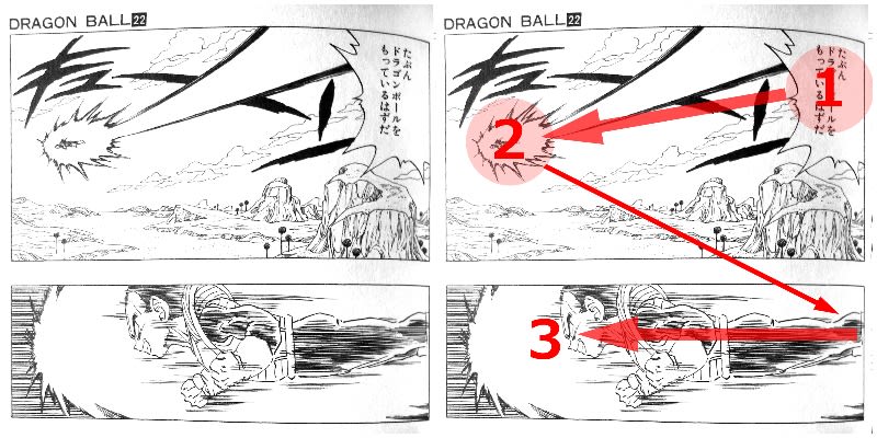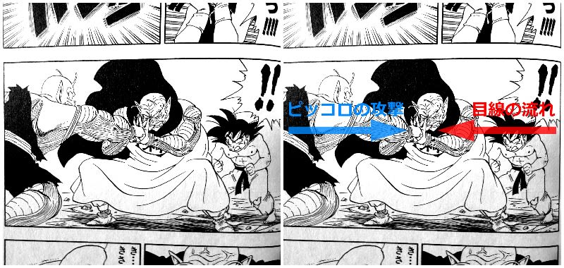 左向き(漫画のページをめくる向き)は視線の動く方向であり、(物語を)前に進めようとする力を持つ。