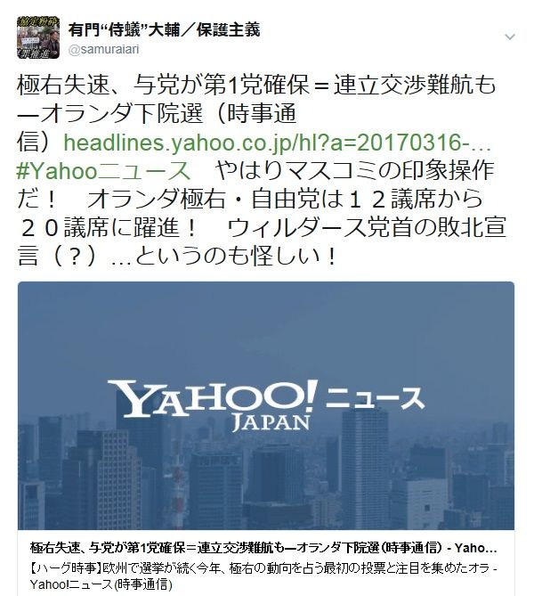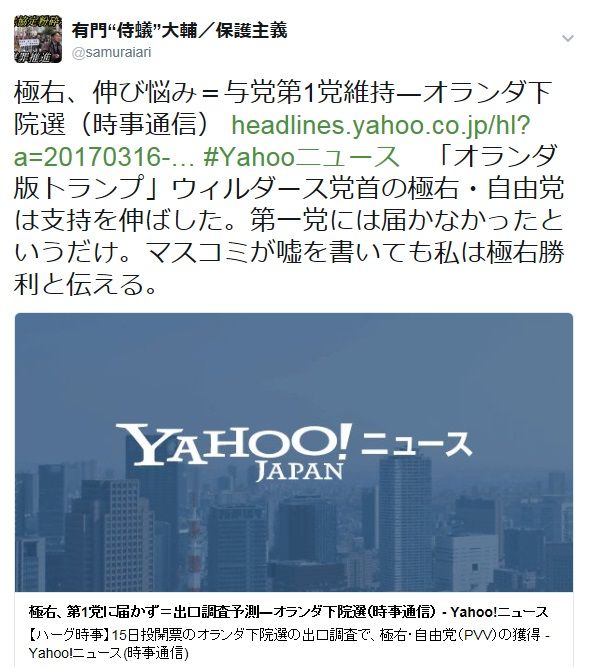 世界的な注目を集めたオランダ下院選では「オランダのトランプ」と評されるヘイト・ウィルダース党首率いる極右・自由党が12議席から20議席へと大躍進。