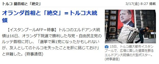 下院選で勝利した直後のルッテ首相に対し、トルコのエルドアン大統領が「選挙には勝ったかも知れないが、友人(トルコ)を失ったことを覚えておけ!」と通告される始末。もはや国交断絶を通り越してオランダとトルコとで準戦時状態にある。