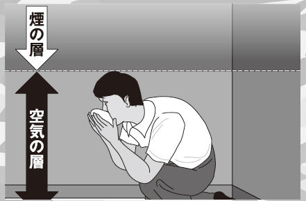 逃げるときは、息を止めず少しずつ呼吸しながら姿勢を低くして煙の層を避けつつ移動しよう。