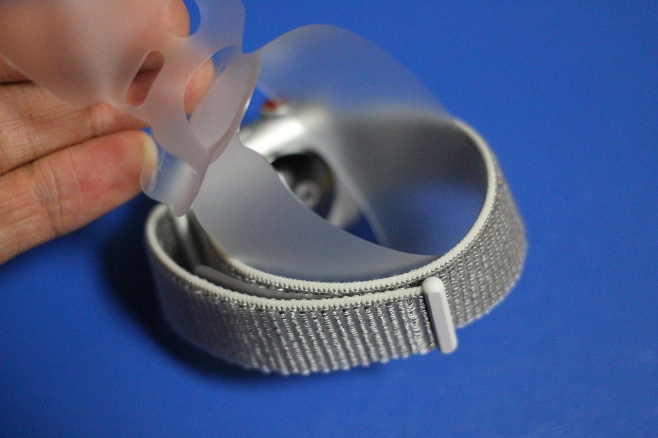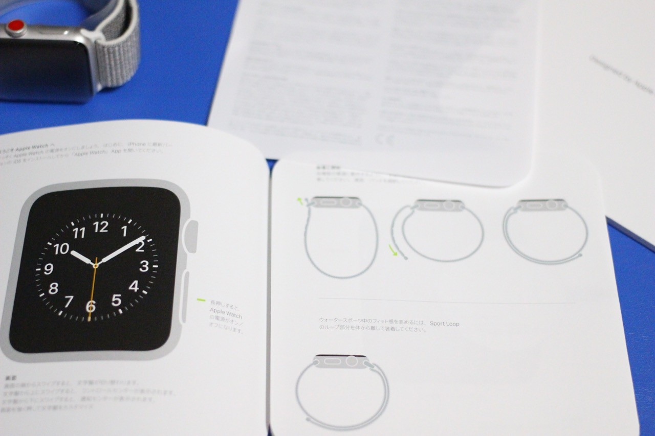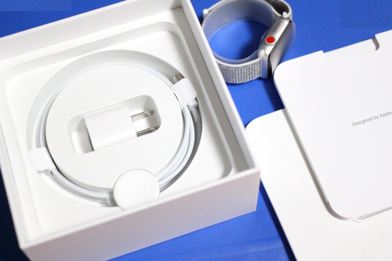 パッケージを開けるとすぐにApple Watch Series 3の本体が現れ、すでにバンドのSport Loop Seashellが装着されています。本体の下には初期設定の仕方などが描かれたリーフレットなどの紙類と専用の磁気充電ケーブル、充電アダプターが同梱されています。ケーブルは紙でまとめられていますが、破かずに外せるようになっているのは良いところでしょうか。