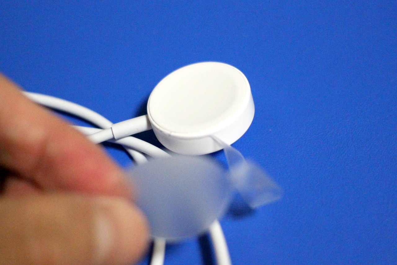 専用USB充電ケーブルの先にはワイヤレス充電部分があります。この部分とApple Watch Series 3の本体を覆っている保護シートを外します。赤いクラウンがこれまでのApple Watchと外観部分で違うApple Watch Series 3の特長です。