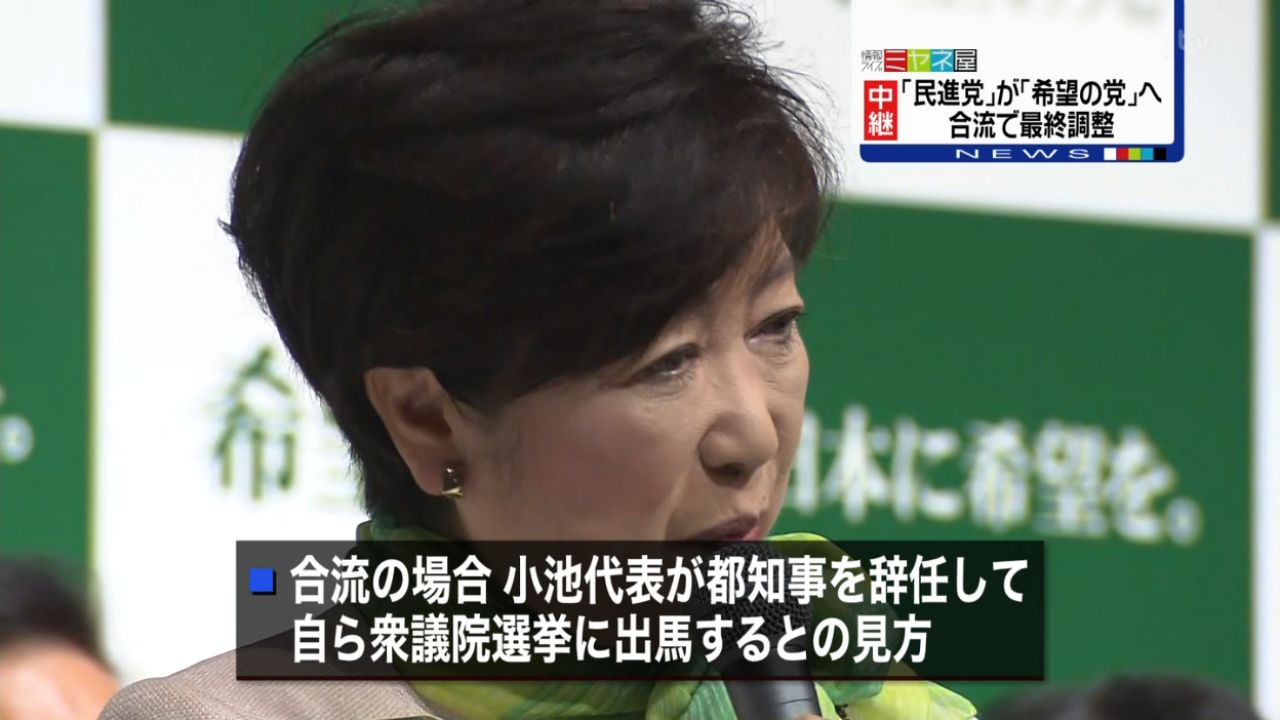 関係者によると、小池代表が党のトップに就任する方向だという。またその場合、小池代表が都知事を辞任して自ら衆議院選挙に出馬するとの見方が出ている。