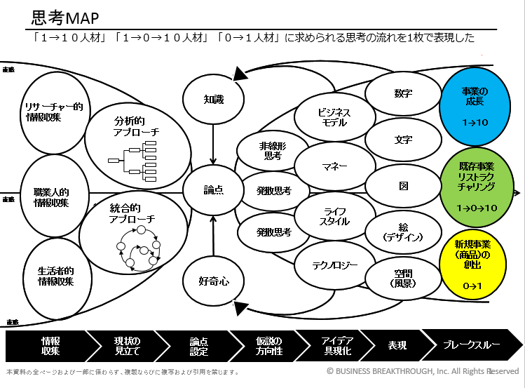 「1→10人材」「1→0→10人材」「0→1人材」に求められる思考の流れを1枚で表現したものが、「思考MAP」です。