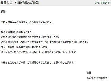 今後は、「新たにまた一からスタートするくらいの気持ちで」マイペースに頑張っていきたいとして、「よければ、生暖かな……冷たい目でもいいので、こんな奴居たなくらいの気持ちで、心に留めていて下されば幸いです。のろのろ歩きの私ですが、どうぞ、今後とも宜しくお願い致します」とつづった種田さん。最後は、「この場をお借りして、言わせてください。ただいま!!」と締めくくっています。