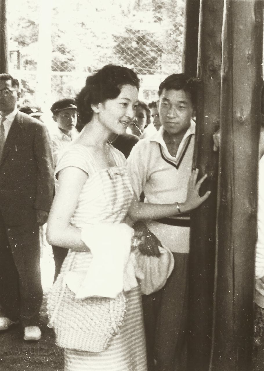 左写真上は本物かもしれないけど、この男性の横に貼ってそうだけど?左下は偽美智子さんを貼ったのね。髪の全面が切ったように直線ね。この時代から歪められているのよ。腹が立つわ。