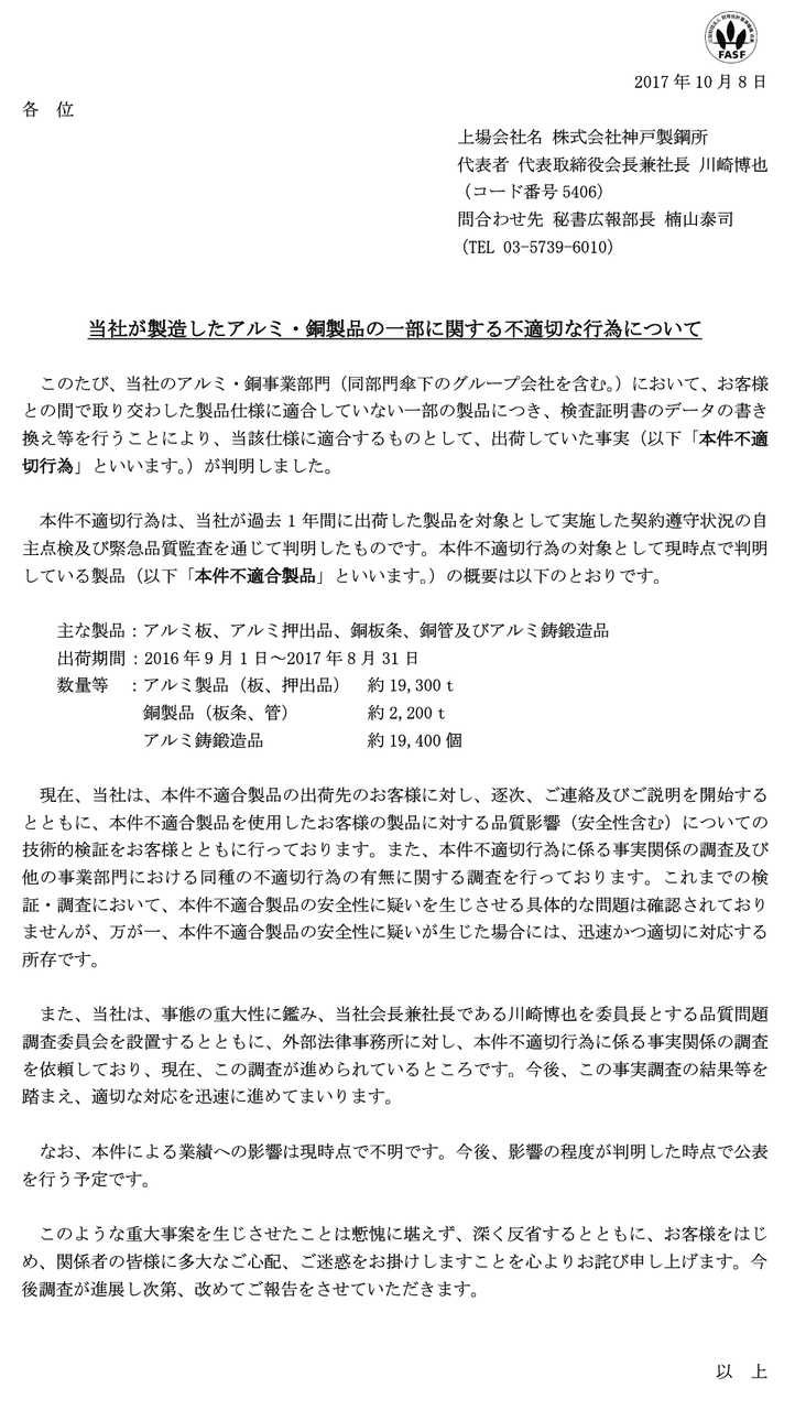 2017/10/09 08:30 神戸製鋼所 アルミ・銅製品の一部に関する不適切な行為について