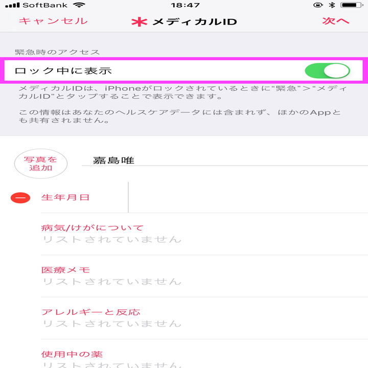 iOS 11の新機能では、ロック画面で医療情報(メディカル ID)を提示できるようになった。