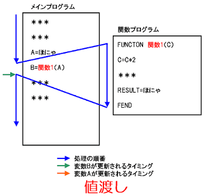 プログラムの処理の順番と変数が更新されるタイミングを書いた図です。左側のメインから右側の関数へ引数を渡すのですが渡し方に“値渡し”と“参照渡し”(C++と同じものと思ってもいいのかな?)があります。