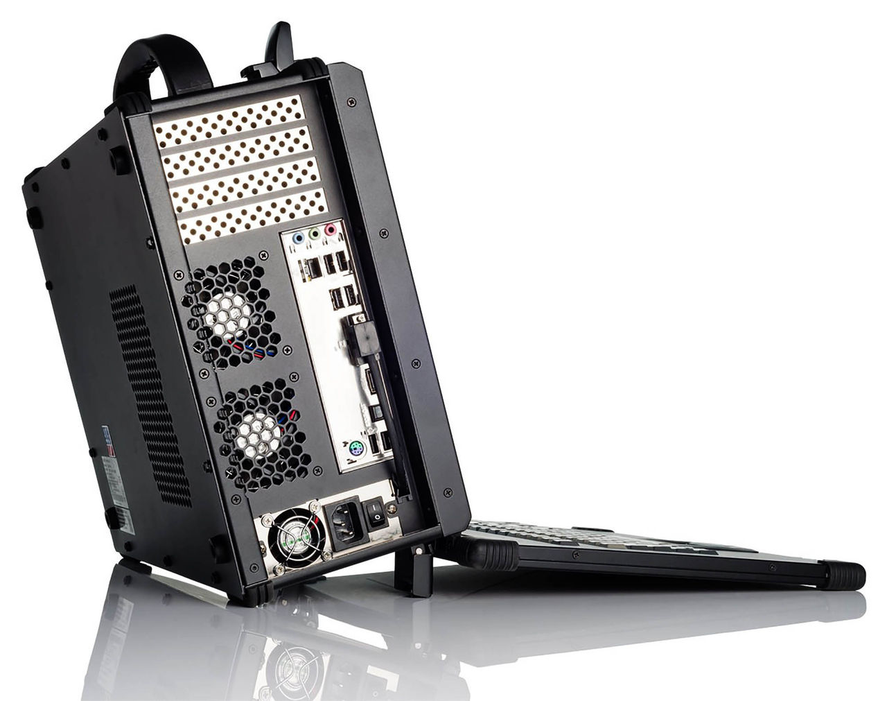 DuraPACはデスクトップパソコンに取っ手がついたようなデザインで、キーボード部分を折りたためば、アタッシュケースやバッグのように持ち運ぶことが可能。しかも外装が超頑丈に作られており、アルミシートメタル仕様。有事や災害時などの国防に関するシーンでも使用可能だ。