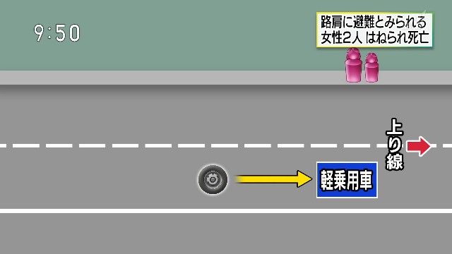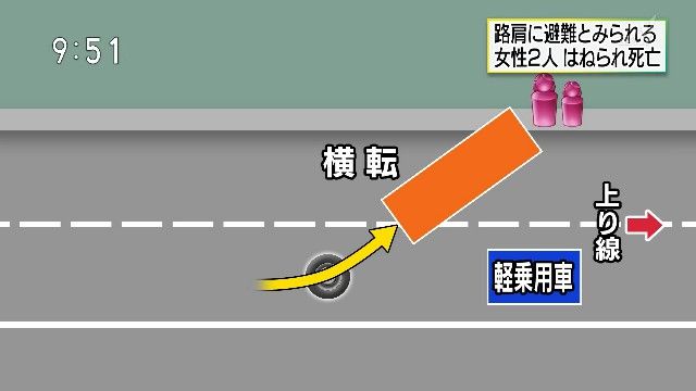 路上のタイヤを踏んで事故→路肩に避難→タイヤを踏んで横転したトレーラーが突っ込んで女性2人死亡