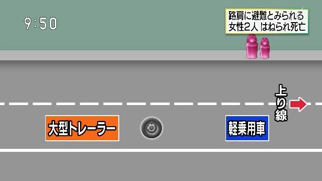 このため、警察は女性2人が乗った軽乗用車が路上に落ちていたタイヤに乗り上げ、車を降りて路肩にいたところ、さらにタイヤに乗り上げて横転した大型トレーラーにはねられたものと見て、詳しい状況を調べています。