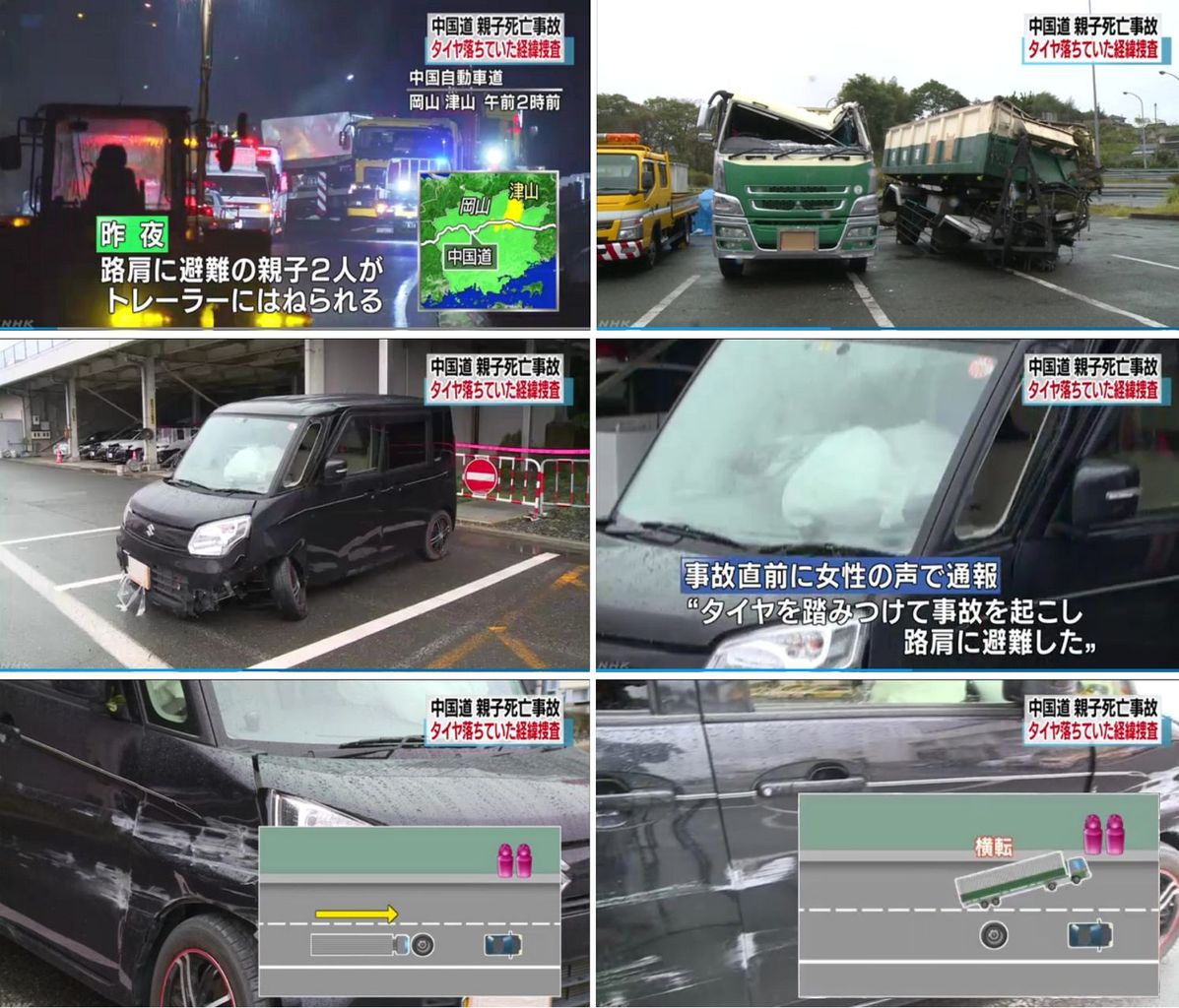 18日夜、岡山県津山市の中国自動車道で、事故を起こして路肩に避難していたと見られる女性2人が、後続の大型トレーラーにはねられ死亡しました。警察は女性2人が乗った車が路上に落ちていたタイヤに乗り上げ、さらに大型トレーラーもタイヤに乗り上げて横転したと見て、詳しい状況を調べています。