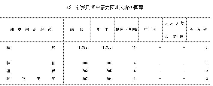 しかし、果たして日本のヤクザの3割が在日なんて、そんなことがありうるでしょうか? 法務省統計局のデータに、「矯正統計」というものがあります。その中には「新受刑者中暴力団加入者の国籍」というものがあります。ヤクザ全体の構成員の国籍は分からないものの、受刑者の国籍がわかればある程度の推測はつきます。もしも在日がヤクザの3割を占めているのなら、暴力団関係の受刑者も、3割近くが在日であるはずです。