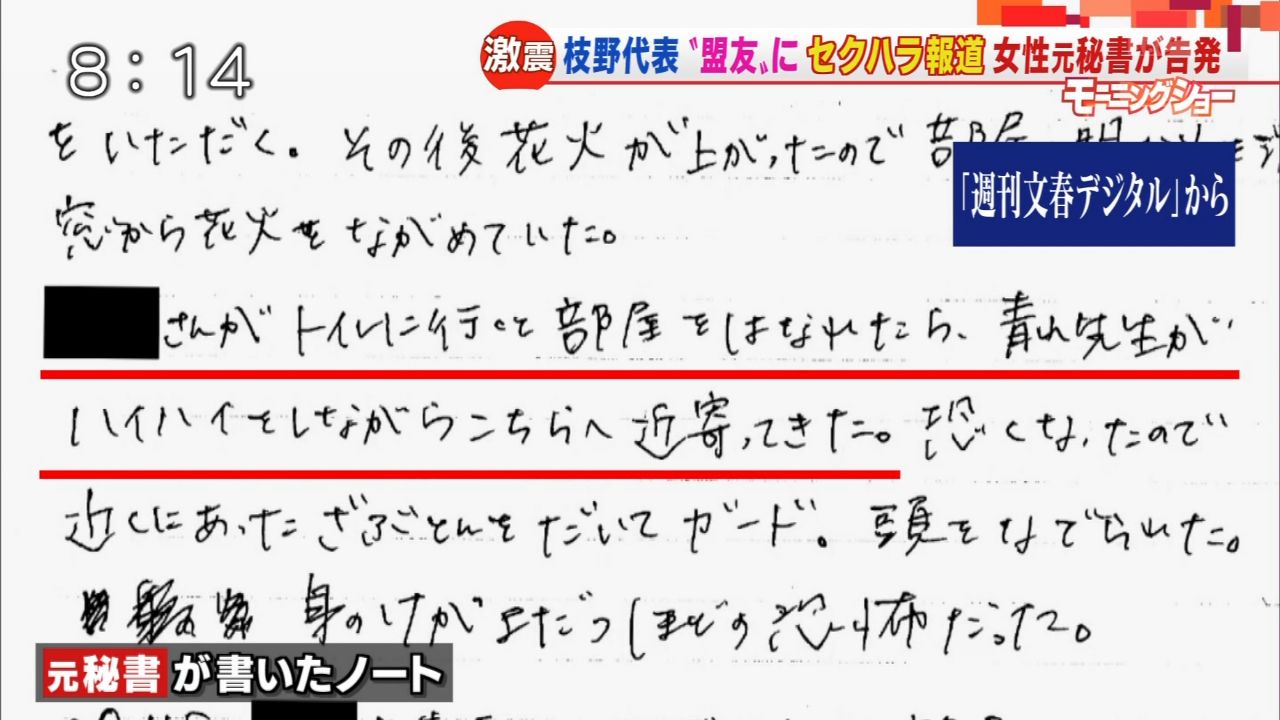 セクハラの被害にあったとされるのは今年夏まで秘書を務めていた20代半ばの山田麻美さん(仮名)。麻美さんに取材を申し込むと、「記憶だけでお話しするのは控えたい」とB5のキャンパスノートを持参し、青山氏から抱きしめられたり、キスを迫られたりするなど、数々の「セクハラ被害」を受けたと証言した。ノートには、日付、場所、感想など、青山氏からの「セクハラ被害」の詳細が約40ページにわたって綴られていた。