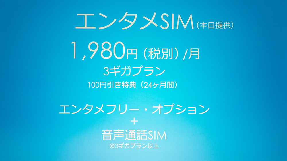 従来はエンタメフリー・オプションは月間6GB以上のデータ通信容量プランを対象に加入できるという内容だった。しかしながら、9月29日のリニューアル後は、月額料金が1,600円の音声通話SIM付きの3ギガプランとエンタメフリー・オプションをセットにして24ヶ月間100円引きする1,980円の「エンタメSIM」も提供している。