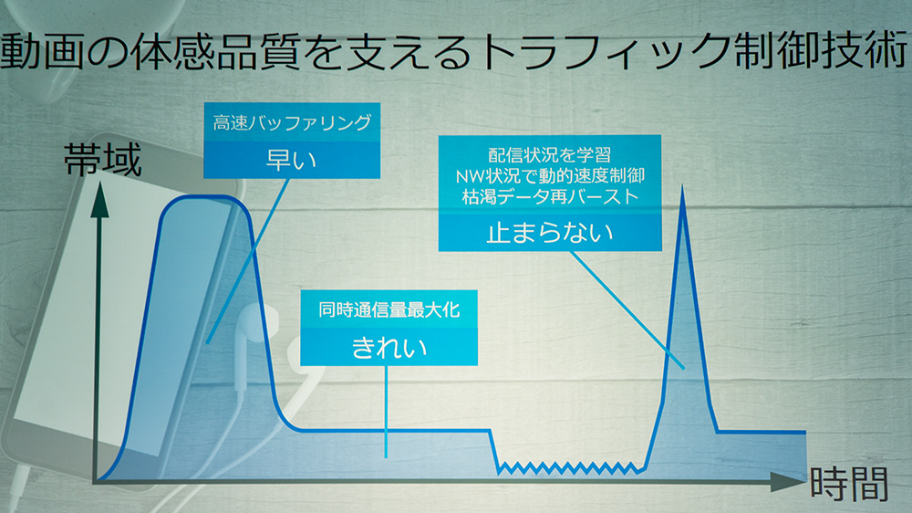 そこでトラフィック制御技術によって、動画再生時のバッファリングには帯域を多く割り当て、バッファリング後は帯域を抑えるようにする。これによって例えば動画視聴を途中でやめた場合、先読みのための無駄なトラフィックが軽減できるなどのメリットがあるようだ。