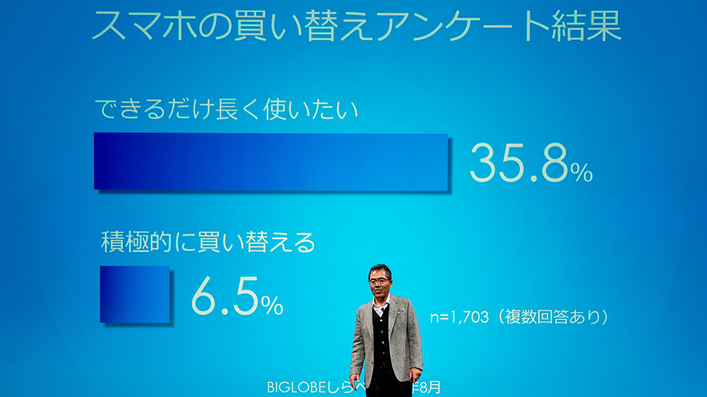 同社が行ったアンケートによると、スマートフォン(スマホ)を積極的に買い換えるという回答は6.5%であるのに対して、長く使いたいという回答が35.8%もあったのだという。