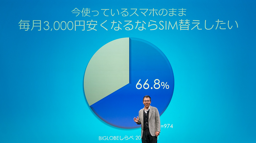 さらにスマホをそのままで、毎月3,000円安くなるならSIM替えしたいという回答が66.8%もあり、こうした潜在ユーザーをターゲットとしているのが新しいBIGLOBEモバイルなのだ。一般層の格安SIMへの認知度が低い一方で、MVNOの数が飽和状態にある現状ではこうした戦略が重要となる。