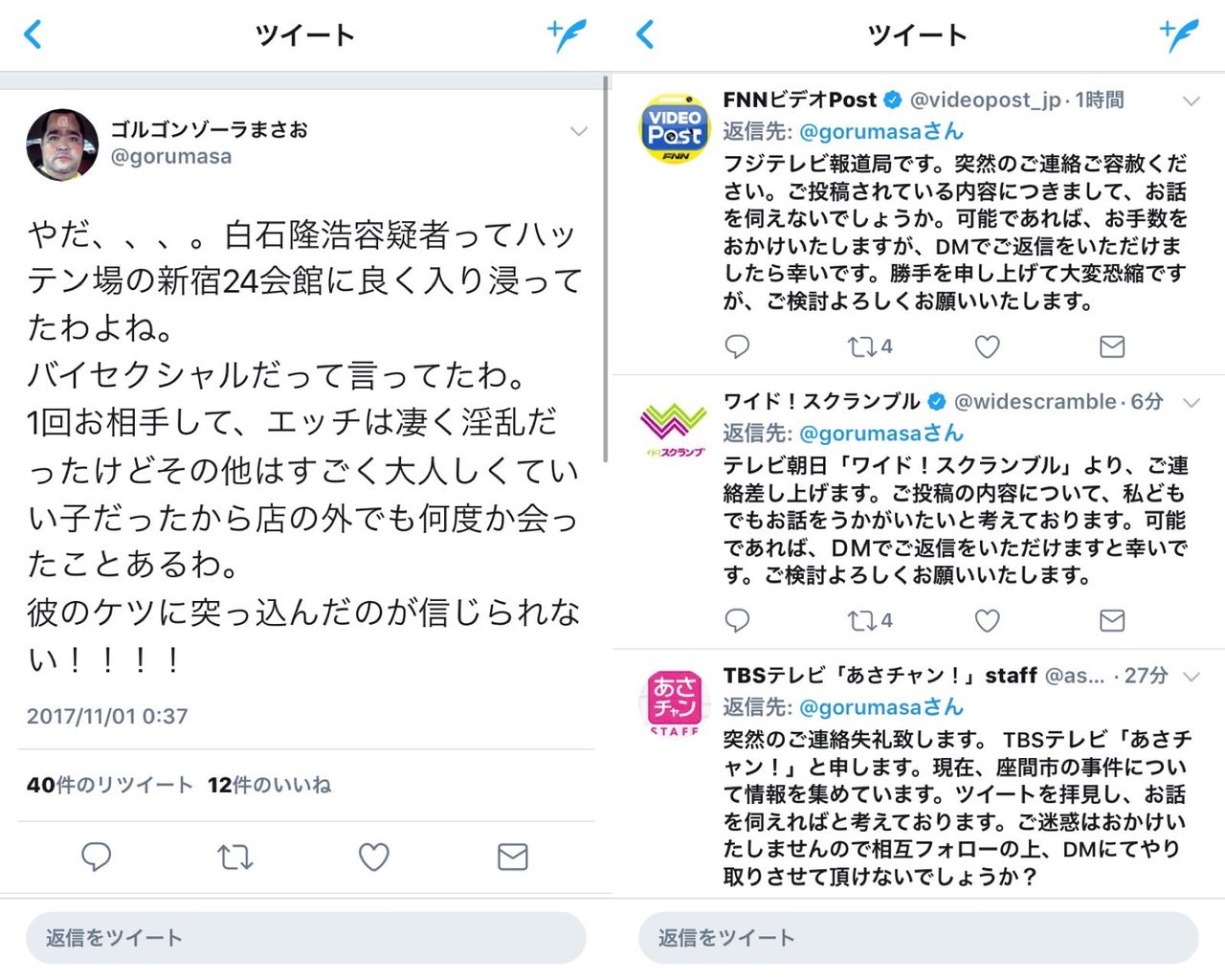 【Twitter】 「やだ、白石容疑者のケツに突っ込んだのが信じられない!」 → マスコミ殺到「突然のご連絡失礼します」