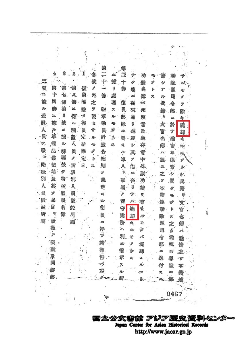 功績名簿は死没者及生存者中殊勲功績を有するものは焼却することなく速に従来通り進達し其の他に在りては焼却するものとす。