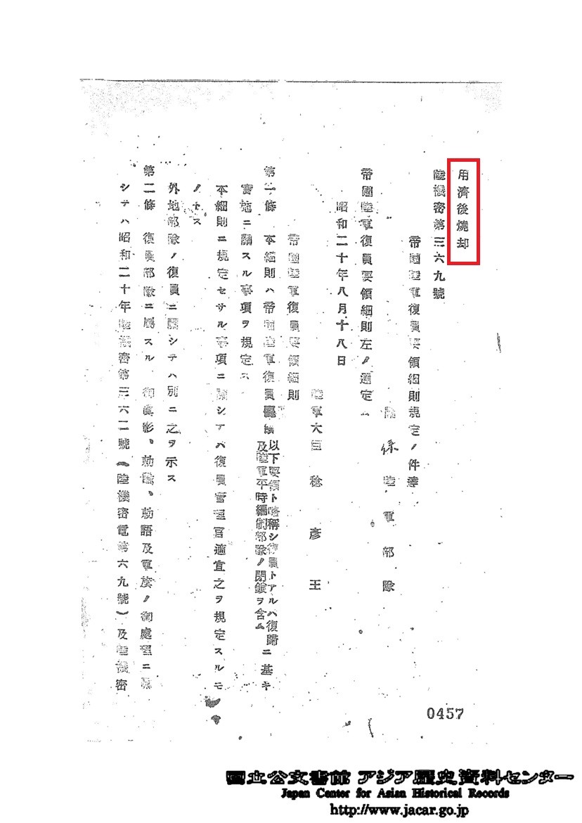 戦時名簿、考科表等は死没者にして留守業務処理の終了せざるものを除き焼却するものとし兵籍、文官名簿は悉皆之を本籍地連隊区司令部に於て確実に保管し置くものとす之が為現に部隊に保管しある兵籍、文官名簿は速に之を本籍地連隊区司令部に送付するものとす。