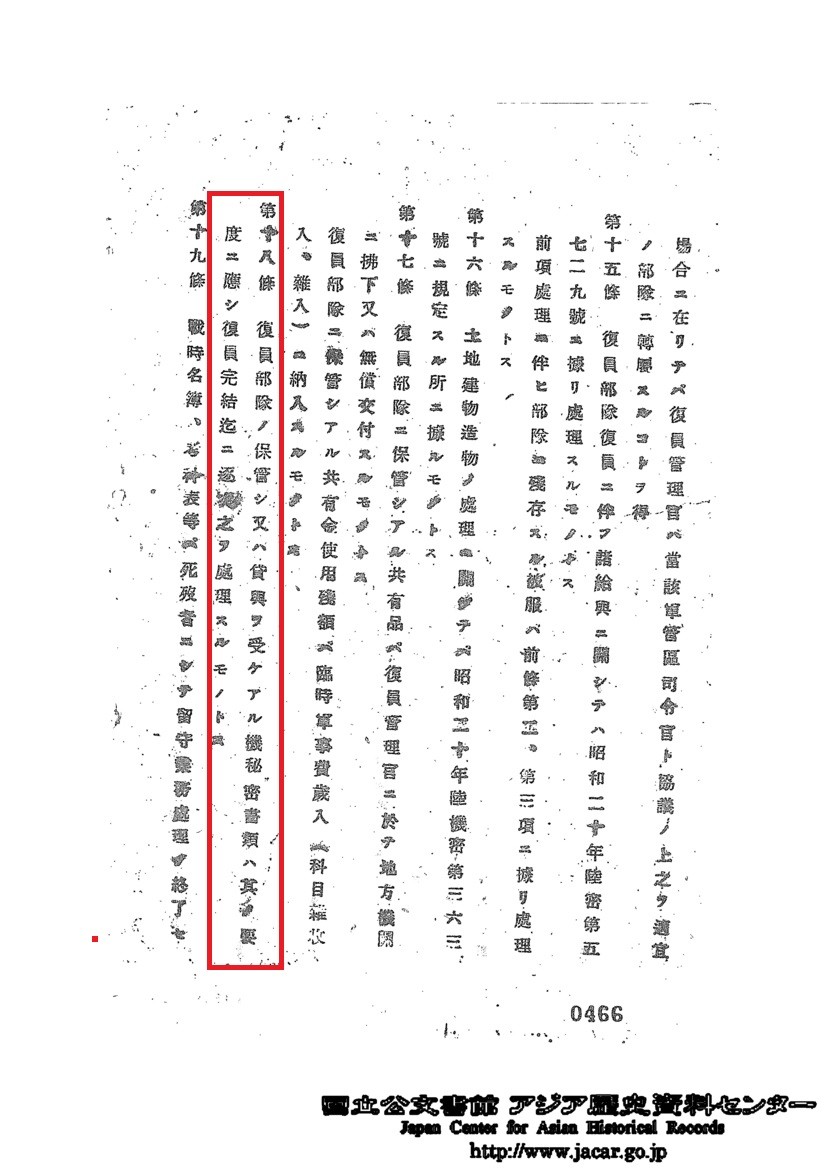 復員部隊の保管し又は貸与を受けある機秘密書類は其の要度に応じ復員完結迄に逐次之を処理するものとす。