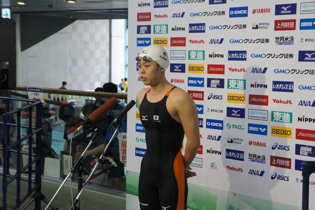 女子100mバタフライは50mバタフライでも自己ベストを更新し勢いに乗る星奈津美選手がトップで決勝へ進出。「100mでも2年間ベストが出ていない。50mで出たので100mでも狙いたい。」と決勝への意気込みを語っています。