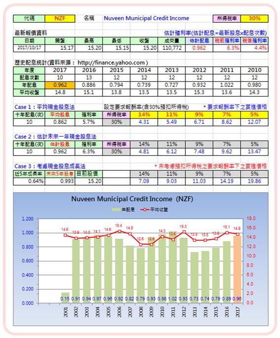 NZF 配息穩定持續,可用平均股利法,設定固定報酬率來,反推買入價位,並利用當前與歷史報酬率相互參照,來決定是否最近買入或是留待觀察。
