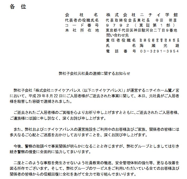 2017/11/14 11:00 ニチイ学館 弊社子会社元社員の逮捕に関するお知らせ