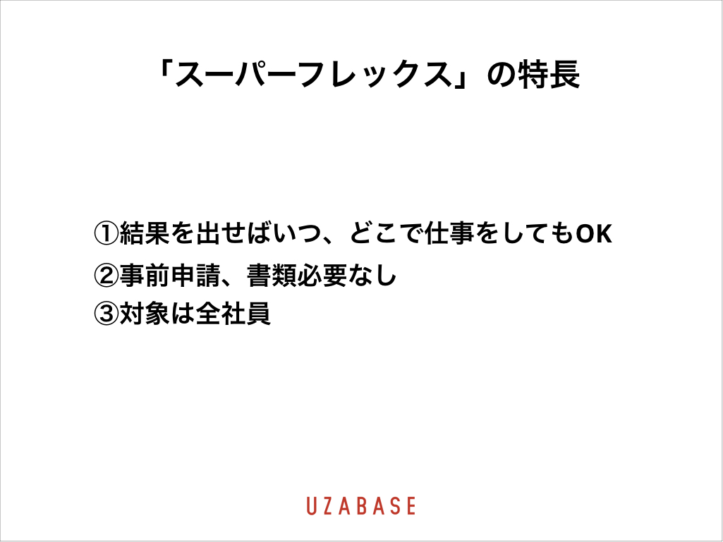 ユーザベースの特長のひとつが、自分の生産性を上げるためであればいつ・どこで仕事をしても良いという「スーパーフレックス」制度です。先日取材いただいた以下の記事でも、「出社の概念がない」会社として取り上げられました。