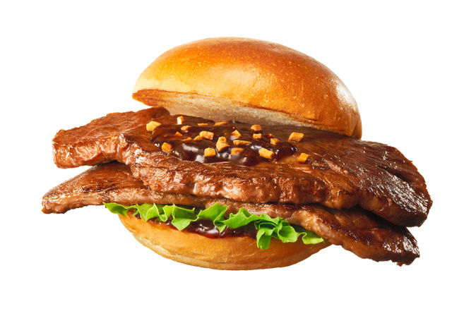 米国産アンガスビーフの肩ロースの中でも、特に柔らかい芯の部分のみを長さ約15cm、重さ約100gにカットしたビーフステーキに、淡路産のオニオンソテーと青森県産ニンニク、北海道産丸大豆を使用した醤油などを合わせたロッテリアオリジナルステーキソースと合わせ、青森県産のフライドガーリックをトッピング。赤身肉のうまみと、香ばしいスソースとの相性がよい一品。