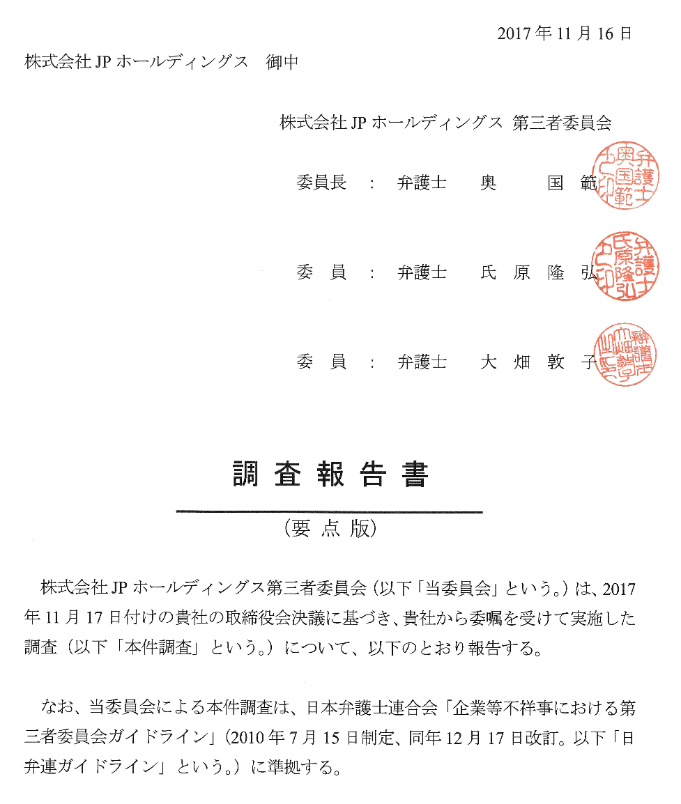 2017/11/17 JPホールディングス 第三者委員会の調査報告書(要点版)