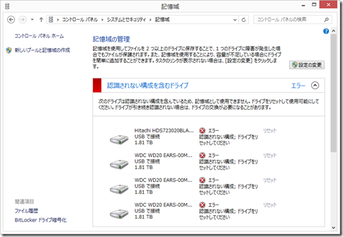 CドライブにはWindowsが入っていてSATA接続。Dドライブはデータだけが入っていてSATA接続。そして、USB接続の外部HDDがE/F/G/H。それで・・・ここからが騒動の発端なのだが・・・このE/F/G/HのHDDを、記憶域プール機能を使って1つのドライブにして使っていたわけよ。