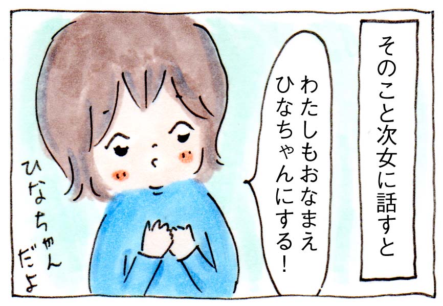 そして先日、次女に「むかし、おねえちゃんがひなちゃんって名前がいいっていってきかなかったんだよ」と話すと・・・