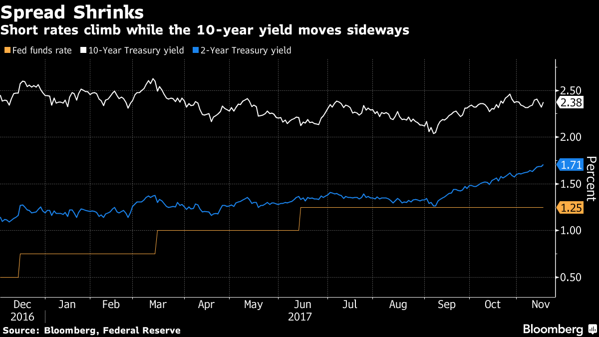 米2年債と10年債の利回り格差、15年12月から半分以下に縮小